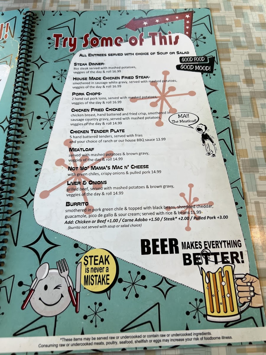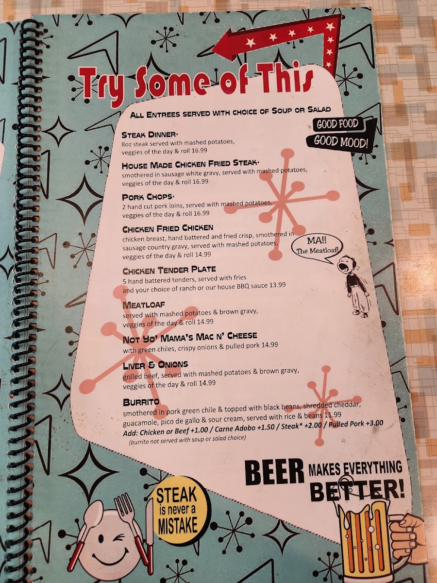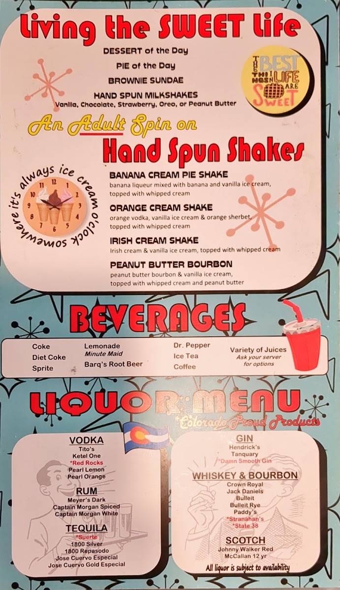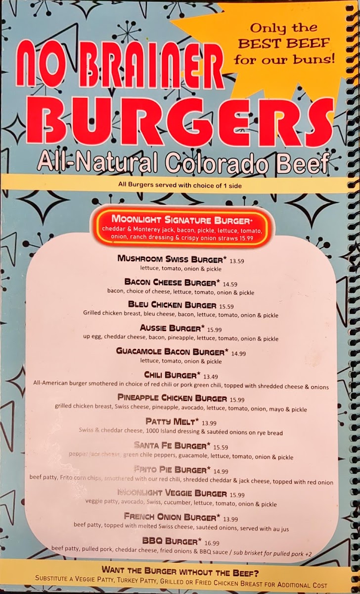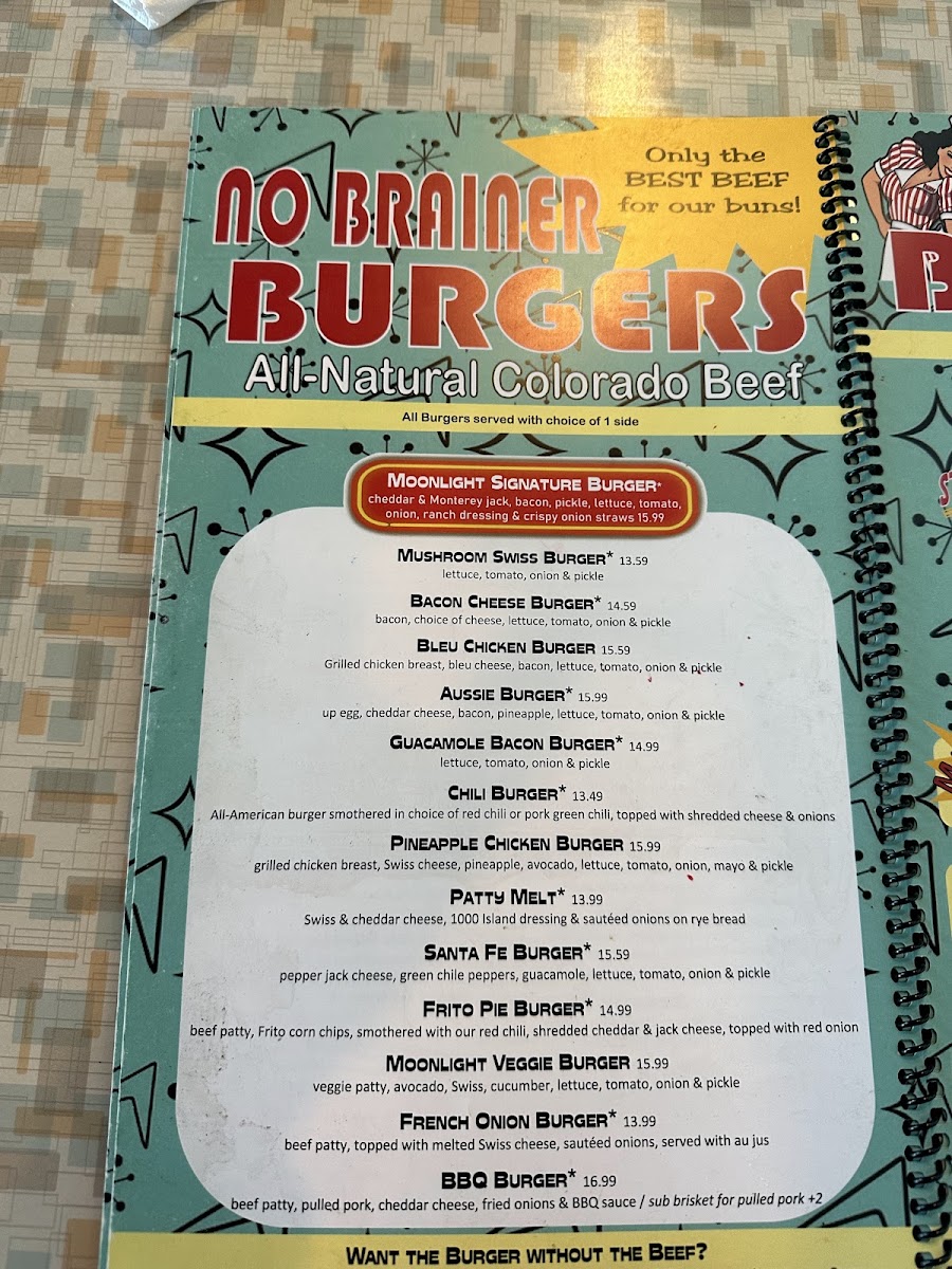 All around The Moonlight Diner serves up taste bud satisfying food, pair that up with a great atmosphere, and spectacular service and you have a must visit Diner in Colorado! I ordered a "build your own" burger with fries, which was delicious, also got a chocolate milkshake to complete the whole Diner experience. The milkshake really blew me away, a little pricey at almost 9, but it definitely hit the spot. It's good to see the staff working as a team. Maribel was my server, she was very friendly, as was every one else. I was checked on regularly to see if everything was going well. They also do a good job at keeping the place clean. If I'm going to nitpick anything, it would be that they could use a Jukebox to really dial that old school Diner feel, but maybe they do have one just not playing at the time of my visit.